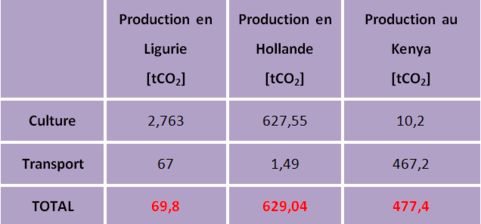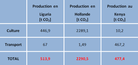 La production méditerranéenne de la Ligurie, n’émet au total que 6 % de CO2 de plus que la production du Kenya (respectivement 513,9 [t CO2] contre 477,4 [t CO2]), malgré l’usage actuel d’énergies fossiles.